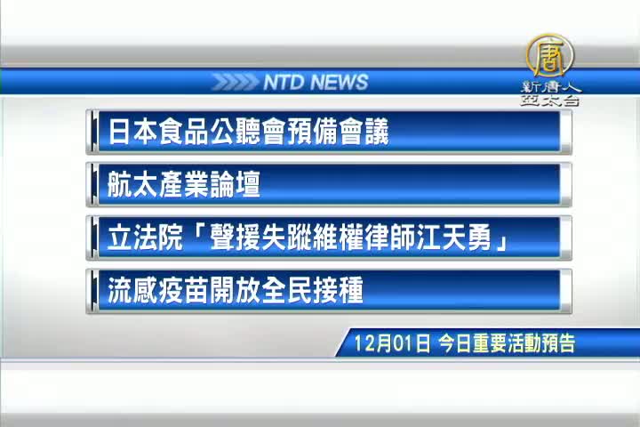 【新唐人亞太台 2016 年 12 月 01 日訊】接著看到,今天,12月1日,星期四,有哪些重要活動。首先是,日本食品公聽會預備會議。航太產業論壇,以及,今天在立法院有一場「聲援失蹤維權律師江天勇」記者會。最後是民生消息,從今天開始,流感疫苗開放全民接種。