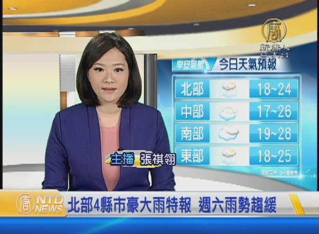 【新唐人亞太台 2016 年 12 月 02 日訊】歡迎您收看12月2日的早安新唐人,我是張祺翎。先來帶您關心今天的天氣情況。又有大雨特報了。氣象局稍早對 基隆市、新北市發布豪、大雨特報,台北市、宜蘭縣發布大雨特報。 今天白天,氣溫回升有限,大部分地區的高溫,約介於24到25度,整天還是偏涼。不過,好消息是,星期六開始,氣溫和雨勢都會 逐日恢復持平,帶您一起來看到國際媒體重要訊息。