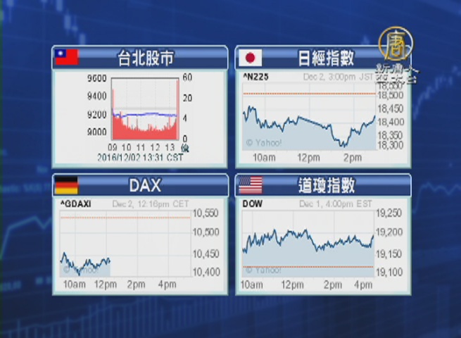 【新唐人亞太台 2016 年 12 月 02 日訊】外傳蘋果電腦減少對iPhone7零組件下單,美國科技股指數連續兩天拉回,連帶影響 今天台灣的電子股同步大跌,拖累大盤走弱, 終場收跌74.04點,不僅跌破5日線,更跌破9,200點大關,收在9189.49點,跌幅約0.8%,成交值新台幣747.34億元;。 另外,來看到,美元再度走強,亞幣回貶,新台幣今天以31.923元兌1美元作收,貶值3.1分,匯價連4貶 並創下近一週來新低。
