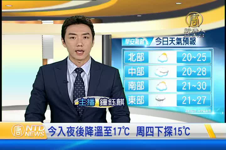 【新唐人亞太台 2016 年 12 月 05 日訊】歡迎您收看12月5日的早安新唐人,我是鐘鈺麒。先來帶您關心今天的天氣情況。又是一個星期的開始了,今天,北部高溫會比昨天略降3度。預計會來到24度、25度;而入夜後,各地溫度都會往下降,中部以北的低溫,將來到17、18度,南部和花東也只有19、20度。而星期四,中部以北、東北部最低溫還會再下探,來到15度,提醒觀眾朋友,做好保暖。 帶您一起來看到國際媒體重要訊息。