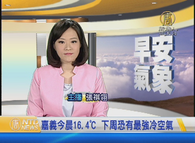【新唐人亞太台 2016 年 12 月 09 日訊】歡迎您收看12月9日的早安新唐人,我是張祺翎。先來帶您關心今天的天氣情況。今天清晨,嘉義因為輻射冷卻影響,出現了16.4度的低溫,今天各地高溫會在24度到26度,不過提醒您,下星期二,冷空氣南下,中部以北將明顯轉涼,下星期三、星期四,可能只有14度,有機會是入冬以來最強冷空氣。帶您一起來看到國際媒體重要訊息。