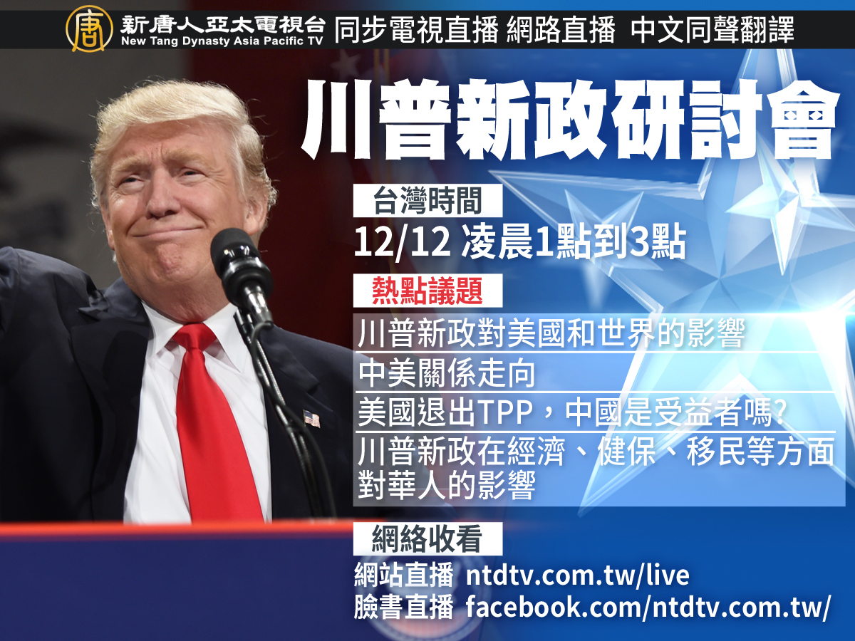 【新唐人亞太台 2016 年 12 月 10 日訊】新唐人電視台獨家推出「川普新政」研討會,邀請川普競選陣營高層、共和黨資深人士,以及新唐人時政專家進行深度點評,並將透過新唐人的電視、官網、FB直播,同時並有專業中英文同聲翻譯,歡迎準時收看。