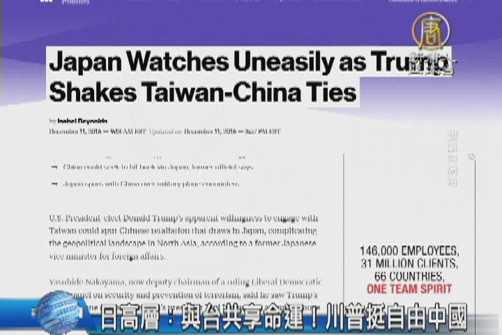 【新唐人亞太台 2016 年 12 月 12 日訊】美國總統當選人川普高調談與台灣總統熱線,對此,日本前外務省副大臣 中山泰秀,向《彭博新聞》表示,川普此舉很聰明,因為這是他就職前的舉動,所以中國政府的反應不會太過激烈。中山泰秀說:通常接來自台灣的電話會對外保密,但川普交接團隊卻對外公布。他說,我認為這是一件好事,代表他們更看重自由中國,而非共產主義中國。中山泰秀強調,任何美對台政策改變,都會影響日本,因為日本和台灣共享一個命運,未來不排除也將尋求與台灣軍事合作。