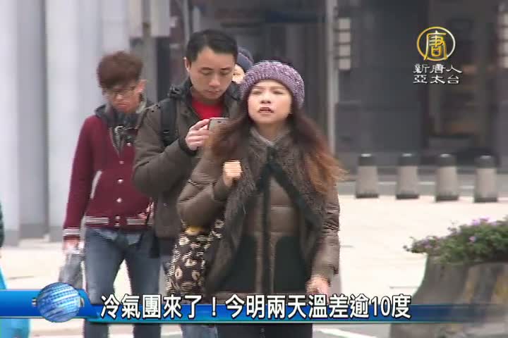 【新唐人亞太台 2016 年 12 月 13 日訊】今年入冬第一波冷氣團,今天晚上就要來報到了。今天,北部、東北部白天高溫還有24度;不過,明天星期三,溫度就會像溜滑梯一樣,低溫只剩下14度,一天內溫差差了有10度之多,而且到週六前,都是偏寒冷的天氣,提醒觀眾朋友要注意;另外,中國霧霾也可能隨著冷氣團南下,提醒有敏感症狀的族群,最好攜帶口罩。