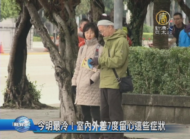 【新唐人亞太台 2016 年 12 月 15 日訊】冷氣團報到,各地幾乎都破入冬以來低溫,今天淡水清晨只有15度,台北街頭最低溫來到14度。預計這波冷氣團影響最明顯的時間,是落在今明兩天,將下探13度。而星期六開始冷氣團減弱,一直到下星期,各地氣溫都會明顯回升。另外,衛福部說,研究指出室內、外溫度差7度以上,容易誘發氣喘和過敏,所以,提醒敏感族群的觀眾朋友,這幾天可以多選擇室內運動,也可以用55度熱水清洗寢具,防止塵蟎生長。