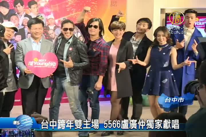 迎接2017年,台中市府公布跨年卡司,除了首次來台中表演跨年晚會的玖壹壹,雙主場分別由滅火器樂團、董事長樂團動感開場, 獨家更請到盧廣仲,還有壓軸獻唱的5566,陪伴大家一起,倒數跨年。