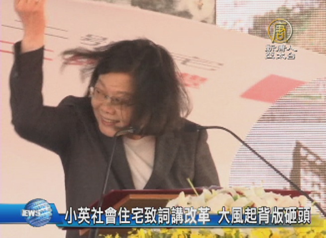 【新唐人亞太台 2016 年 12 月 19 日訊】再來看到,總統蔡英文今天(19日)上午到桃園市參加住宅動土典禮,在致詞的時候,被強風吹落的背版打中。