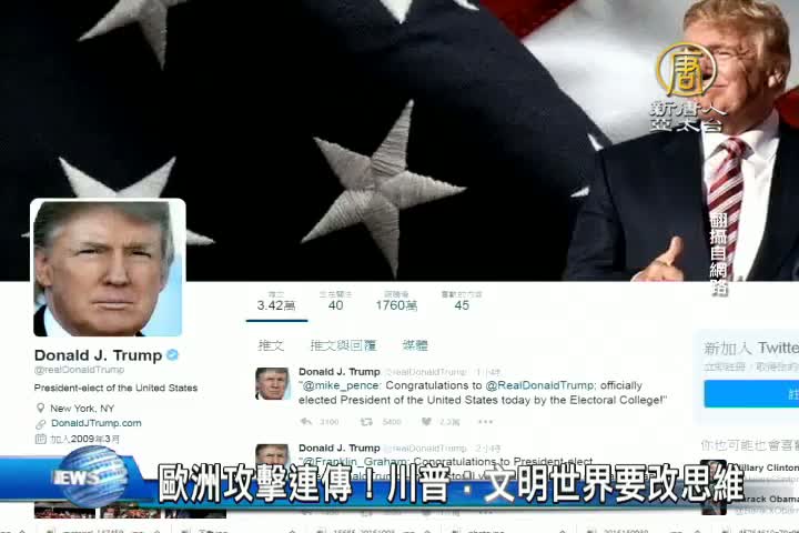【新唐人亞太台 2016 年 12 月 20 日訊】好,歐洲連續發生3起攻擊慘案。對此,美國總統當選人川普 透過推特表示, 土耳其、瑞士和德國今天都發生了恐怖襲擊,情況只會越變越糟,文明世界必須改變思維。川普說,這些恐怖分子以及其區域和全球網絡必須從地球上根除,美國將與所有愛好自由的夥伴一起展開這個任務。
