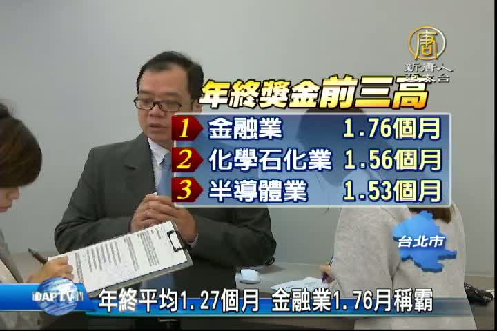 【新唐人亞太台 2016 年 12 月 20 日訊】每到歲末年終,上班族都很關心,今年的年終獎金會領多少?根據人力銀行調查,上班族的年終獎金平均有1.27個月,比2015年微幅成長,其中又以金融業最高,平均有1.76個月,其次是石化業1.56個月,第三名是半導體1.53個月,而2017年企業加薪機會不小,平均有3.88%!