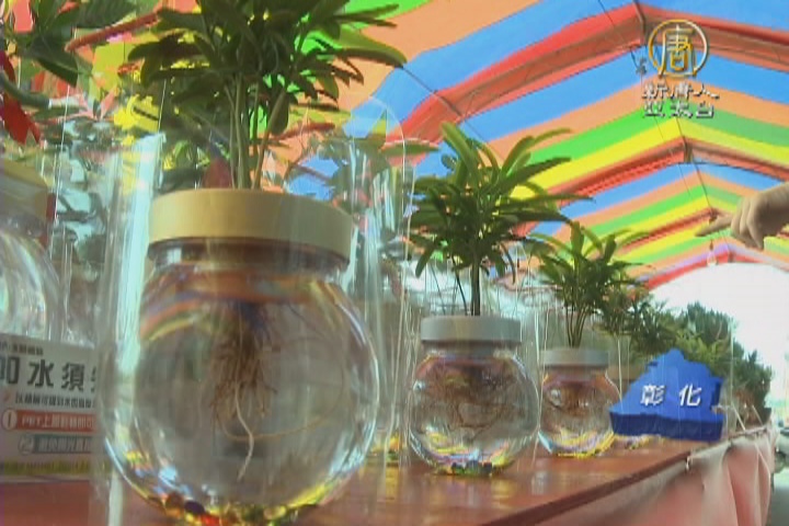 利用水耕的方式栽種小盆栽,一方面能展示新鮮的花卉,供民眾參觀選購,擺設成藝術看桌,也有敬天祈福的含意。