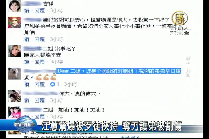 【新唐人亞太台 2016 年 12 月 22 日訊】台語歌后江蕙的親弟弟,日前在住處遭歹徒持鐵器打傷,江蕙今天在臉書上驚爆,當天她也被歹徒挾持, 經紀人陳子鴻表示,當天江蕙在樓下聽到弟弟慘叫,認為不對就衝上去,發現歹徒手上拿刀,江蕙就衝過去把刀握住,不讓歹徒傷害弟弟,僵持很久,歹徒就把江蕙推倒在地,頭就撞到地上腫一個包,當歹徒彎下腰要撿東西,江蕙就趁機會趕快奪門跑出報警。江蕙目前傷勢無大礙;但她寫到,腦子還是抹不去弟弟,滿臉血跡驚嚇淒厲的尖叫聲,她說,比起被挾持,她更不捨千百倍的是,善良而智能不足的弟弟!粉絲紛紛稱讚,江蕙勇敢、偉大。目前58歲的嫌犯陳金標已經落網,而警方也證實了江蕙的說法屬實。