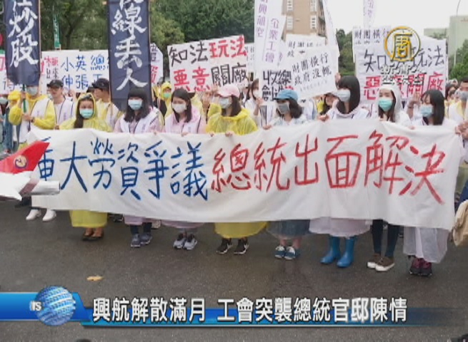 2016-12-20 11:05:47好,興航今天是召開董事會討論員工資遣費,興航工會前往興航總公司門口抗議,要求董事長林明昇應親自出席12月21日的第3次大解法勞資協商會議,並通過工會訴求,給予員工額外補償。