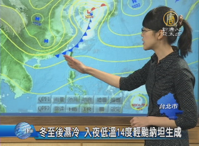 【新唐人亞太台 2016 年 12 月 22 日訊】歡迎回來。經歷炎熱的冬至,今天(22日)終於感受到涼意,氣象局表示,鋒面報到,今晚入夜到明天(23日)清晨,北部低溫將下探到只有14度。不過,都已經12月了,今年第26號颱風輕颱「納坦」正式形成,下週二外圍雲系將影響台灣,到時北台灣,又將轉為濕冷天氣。