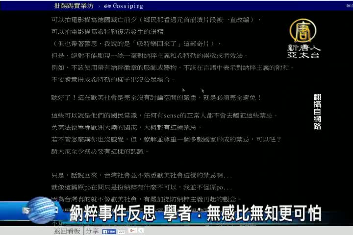 【新唐人亞太台 2016 年 12 月 25 日訊】新竹光復中學學生扮納粹,引發爭議。到底台灣學生是否了解這段歷史,我們街頭隨機訪問,還真的有學生不知道。而台大教授葉丙成則認為,這整起事件,無知可能不是最大的問題。最大的問題是,無感。