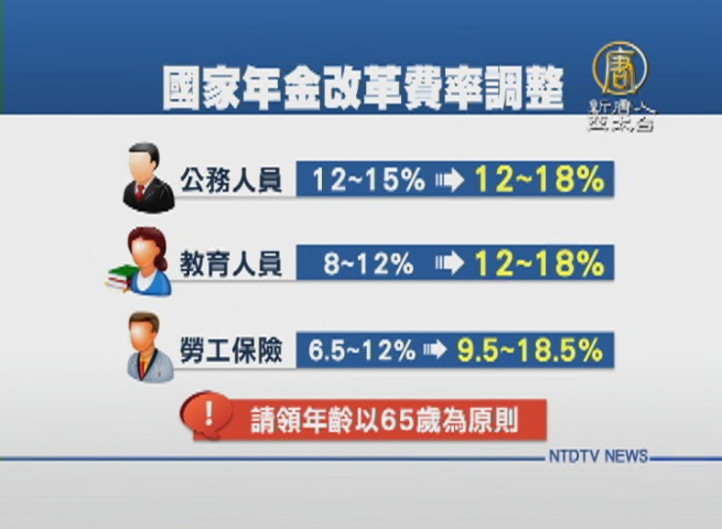 年金改革方案,公務人員,現制法定費率12~15%,教育人員8~12%,研擬調整最高到18%,勞保,從6.5~12%,要調整至9.5%~18.5%,未來公教人員以及勞工繳的保費都變多了。而請領年齡以65歲為原則。