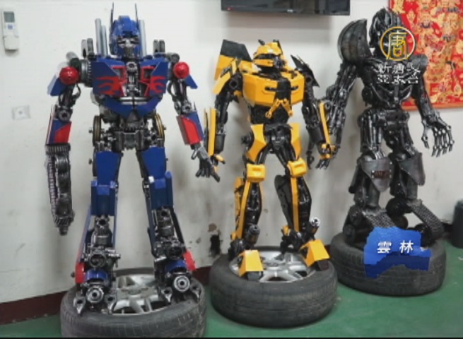 報廢汽車零件,搖身一變成了機器人,車廠主人江先生,用巧手打造自己廠內的變形金剛,讓車廠成了另類觀光景點。