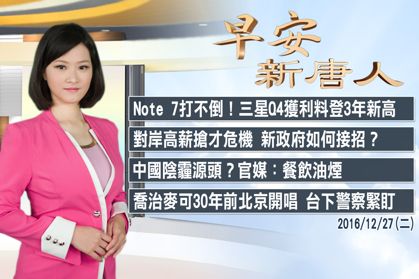 2019-01-21 07:59:57歡迎您收看1月21日的早安新唐人,我是唐潔安,先來帶您關心今天的天氣情況。又是一個星期的開始了,昨天晚上 強烈大陸冷氣團南下。今天白天高溫,北部16、17度,其他地區最高可來到22度左右。星期三,台南以北、和東北部低溫將下探10度;另外,提醒您,境外汙染物也隨大陸冷氣團南下,中部、雲嘉南、以及高屏地區要注意空氣品質,昨晚環保署已經發出紅色警示。帶您一起來看到國際媒體重要訊息。