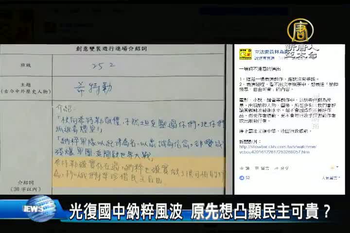 【新唐人亞太台 2016 年 12 月 27 日訊】新竹市光復中學學生變裝納粹風波,以色列、德國在台協會都強烈譴責,校長程曉銘引咎辭職。不過,今天有國民黨有立委,公布了這一場「納粹變裝遊行進場介紹詞」,裡頭寫到,「希特勒確實存在過,納粹也確實做了可怕的行為,所以我們才要珍惜民主自由」。意旨學生的本意是要珍惜民主,再次引起網友討論。