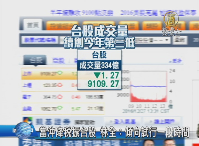 【新唐人亞太台 2016 年 12 月 27 日訊】為了提振台股成交量,財政部和金管會提出台股當沖調降證交稅方案,而隨著歐美外資放假,台股今天量能再創今年以來第3低。不過,行政院長林全透露,當沖證交稅 調降,目前還沒有相關配套,具體幅度也還沒有訂定,未來可能試行一段時間,並與業界進行溝通。
