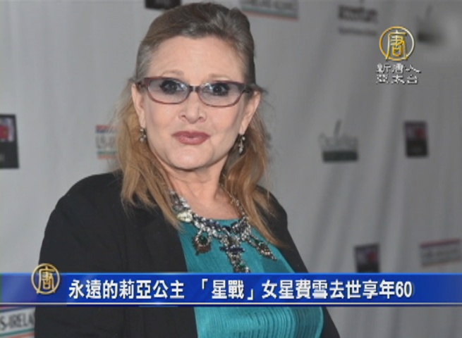 【新唐人亞太台 2016 年 12 月 28 日訊】再來看到,美國著名女星作家、「星際大戰」的莉亞公主飾演者,好萊塢女星嘉莉費雪,心臟病發不治,享壽60歲。