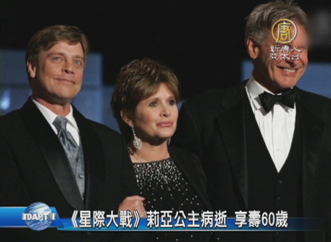 【新唐人亞太台 2016 年 12 月 28 日訊】兩天前,英國著名流行歌手喬治麥可才傳出過世,跨入2017年之前,在經典科幻電影「星際大戰」系列 扮演莉亞公主的嘉莉費雪,因心臟病發傳出過世,享壽60歲。