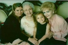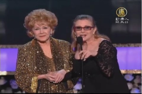 2015年1月25日從影66年,《萬花嬉春》女星黛比·雷諾 (Debbie Reynolds)從也是演員的女兒嘉麗·費雪手中獲得終身成就獎,今天已雙雙離世(新唐人截圖)