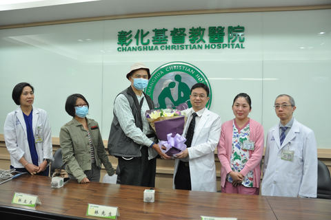 林先生獻花給陳映澄醫師,感謝陳醫師幫他裝設『心伴第二型左心室輔助裝置(HeartMate 2)系統』救命之恩(彰基提供)