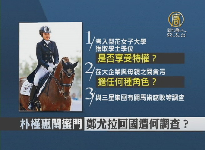 【新唐人亞太台 2017 年 01 月 03 日訊】歡迎回來。韓國總統朴槿惠遭停職後,案件要出現關鍵突破,核心心人物崔順實的女兒鄭尤拉,在丹麥遭到逮捕,將引渡回國,而這背後其實有南韓媒體的舉報。鄭尤拉回國後,將面對哪些調查?請看我們南韓記者的整理報導。