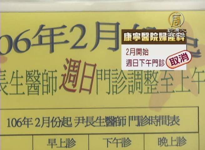 【新唐人亞太台 2017 年 01 月 05 日訊】一例一休上路,嚴重衝擊醫療院所營運。以婦產科聞名的康寧醫院就宣布,從2月開始,週日婦產科下午診 停診,減少人力輪班。另外,中國醫藥大學附設醫院台北分院,則是申請3月1日起,急救病床縮減到100床以下,因為這樣,就可以不必設急診室。