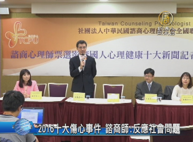 【新唐人亞太台 2017 年 01 月 06 日訊】由心理師票選出,2016年影響國人心理健康的十大新聞,當中小燈泡事件名列第一,成為今年最讓國人傷心的事件。諮商心理師公會全國聯合會表示,十大傷心新聞,凸顯仍有高危險群民眾,這不光是個人問題,而是社會問題。
