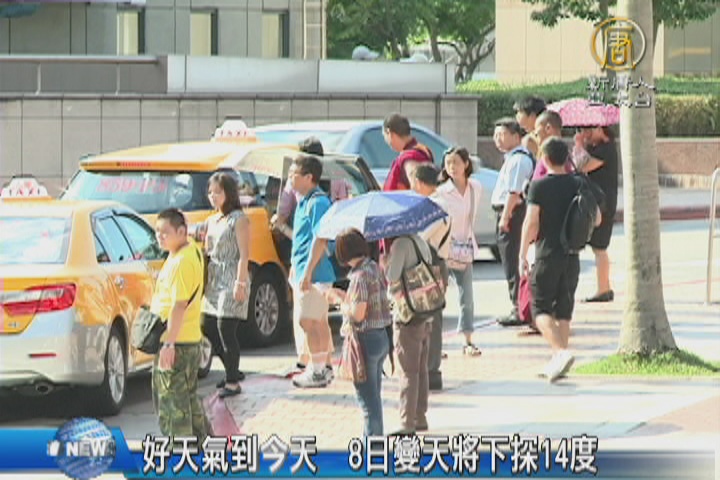 【新唐人亞太台 2017 年 01 月 07 日訊】新聞一開始,帶您關心天氣,2017年第一週,全台天氣都維持在溫暖舒適的天氣型態,不過這樣的好天氣,只到今天為止。中央氣象局表示,明(8日)天開始,東北季風增強,中部以北和東北部,天氣轉涼有雨。下週二起,溫度將明顯一路下滑,低溫預估只有14、15度,提醒民眾要注意日夜溫差。另外,這幾天中部以南嚴重空污的情形,也要等到下週一(9日)才會改善,提醒這段時間民眾出門一定要記得,佩戴口罩。