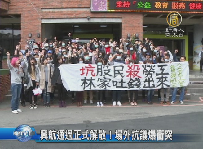 【新唐人亞太台 2017 年 01 月 11 日訊】財經焦點,興航今天9點舉行股東臨時會,討論解散案,由董事長林明昇親自主持,興航小股東砲聲不斷,大約在10點11分左右,股東會還是通過董事會解散決議,宣告興航正式終結。