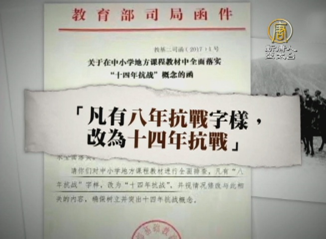 中共教育部1月3號發函,要求大陸各地教育局,排查中小學地方教材,凡是「8年抗戰」,全部改為「14年抗戰」。