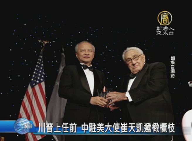 【新唐人亞太台 2017 年 01 月 14 日訊】美國準總統川普即將上任,中國駐美大使崔天凱12日晚間,在美國中國總商會晚宴上,向即將上任的美國新政府伸出橄欖枝,以和緩的語氣指出,中國維持經濟發展、持續反腐等重任,需要和平的環境,而這需要與美國的良好關係;向川普新政權釋放信號,期待未來兩國能走得更近。
