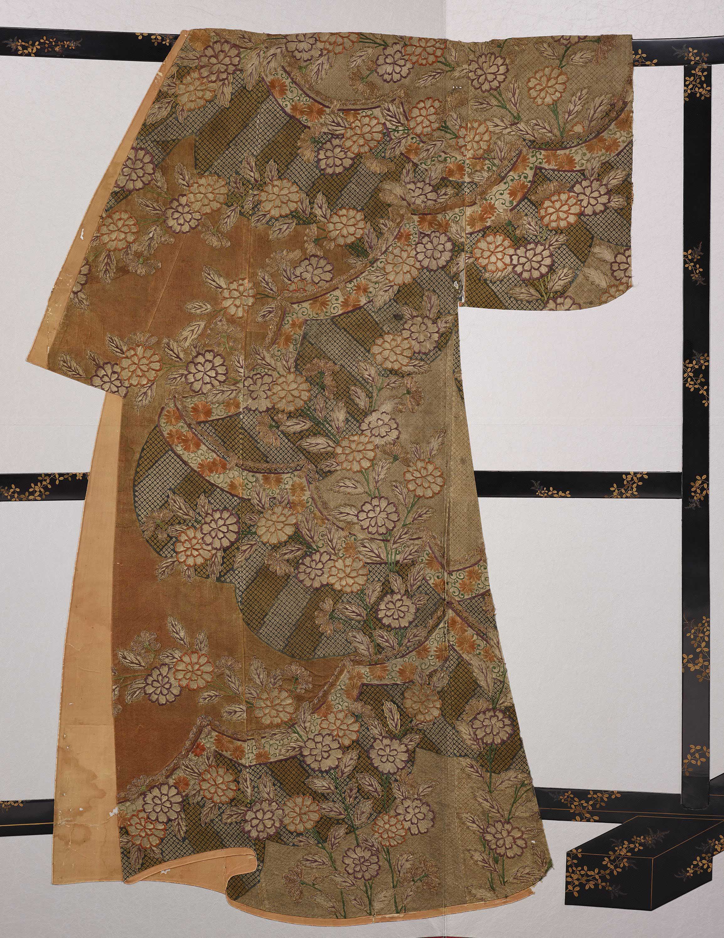 本次精選展件包括「紅地棣棠布幔紋刺繡絞染小袖」,為18世紀江戶時代的作品,以精緻費工的棣棠花紋刺繡搭配絞染技法製作而成,用色華貴,氣質典雅。還有在明治維新之後,受西方頻繁交流影響,結合幾何圖案與西洋紋飾的「白地孔雀紋銘仙和服」,色彩鮮豔,圖案與花色變化非常豐富,散發出迷人的浪漫復古風情,充滿歷久彌新的魅力。