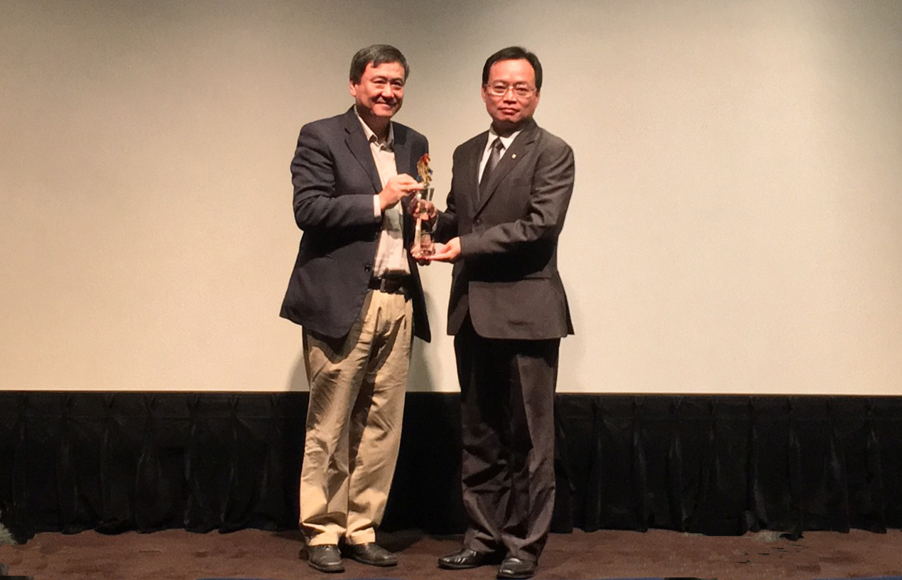 台灣資深電影人李崗導演(圖左),頒發獎座予華航修護工廠李志偉協理(圖右)