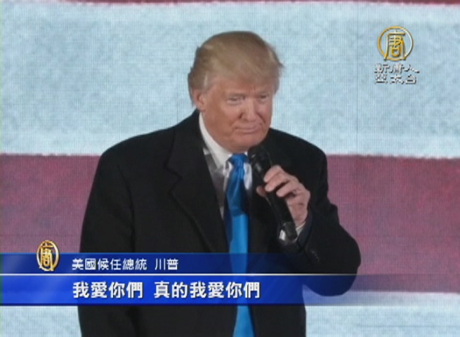 美國候任總統 川普:「18個月前,我做了(參選)這個決定,而你們為這國家做的更多。我是一個傳信者。我只是一個傳信者。這是一段辛苦的歷程。我愛你們,真的我愛你們。我們經歷一段身心俱疲的時期,現在我們想改變困境,真正的改變。」