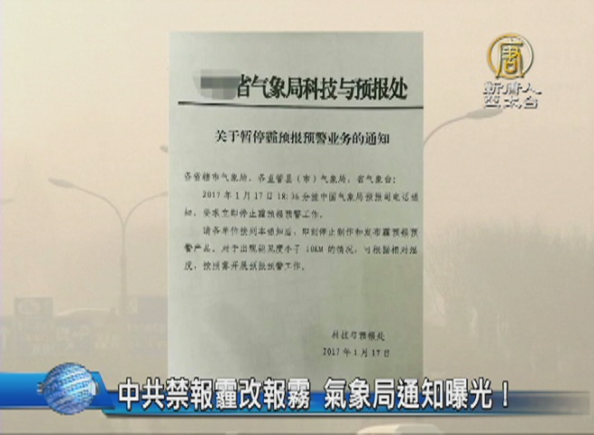【新唐人亞太台 2017 年 01 月 20 日訊】中國氣象局下令各地氣象單位立即停止霾預報預警工作的通知最近傳出。18號,氣象局官員證實這個通知內容屬實,並聲稱,以前氣象局和環保部門發布霾訊息不一致,以後多家單位協商統一發布機制。評論質疑,此舉是掩耳盜鈴,統一造假。