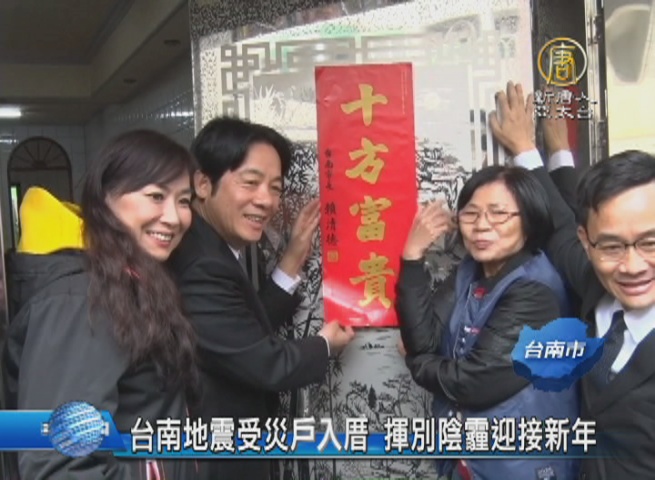 【新唐人亞太台 2017 年 01 月 21 日訊】去年發生在台南的大地震,即將期滿一年,當時在台南新市區的三民街,有12戶民宅因為土壤液化,導致房屋下陷、路面毀損,經過1年的修復工程,房屋修繕告一段落,今日住戶舉辦災後重建入厝感恩活動,受災戶與台南市長賴清德也一起貼春聯,揮別過去迎接新年。