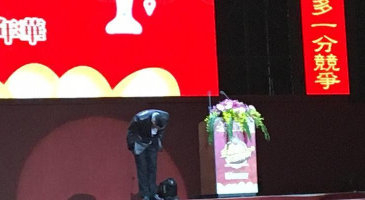 鴻海嘉年華上午熱鬧登場,集團總裁郭台銘帶領希望小學小朋友以及集團員工和眷屬們,一起唱國歌。郭台銘致詞表示,鴻海業績去年交出該檢討的成績單,20多年來首次衰退,他向員工及眷屬鞠躬致歉。