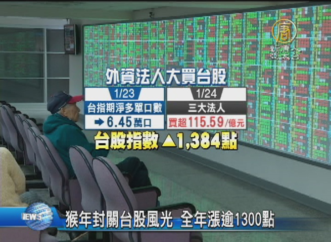 儘管美國退出TPP,國際指數收黑,外資對台股頗具信心,台指期淨多單部位來到6.45萬口水準 (1/23日),今(1/24)天三大法人,包含外資陸資、投信、自營商,合計買超新台幣115.59億元。總計猴年,台股指數大漲1,384點,雞年開盤日,有望挑戰9500點關卡。