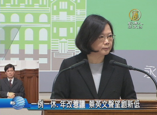 【新唐人亞太台 2017 年 01 月 24 日訊】總統蔡英文上任8個月,民調卻屢屢創下歷史新低,台灣民意基金會,今天公布的最新數字,總統聲望僅剩33.8%,而三大主因包括內閣滿意度下降,一例一休,以及現在進行式的年金改革。