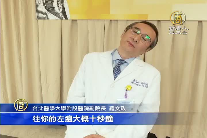 台北醫學大學附設醫院副院長 羅文政:「平常在使用電腦的時候,首先我們一個小時左右,我們讓我們的身體先放下來輕鬆肩膀放下這時候呢脖子輕輕往後仰,大概十秒鐘,然後呢再往你的右邊,大概也是一樣十秒鐘,往你的左邊,大概十秒鐘,然後你再把你的雙手往上頂,同時 脖子往後仰,然後畫一個圓形,然後到我們的背後,這樣做一個伸展的動作,這樣大概短短的十秒鐘,就能讓我們整個肩頸達到舒緩的目的。」