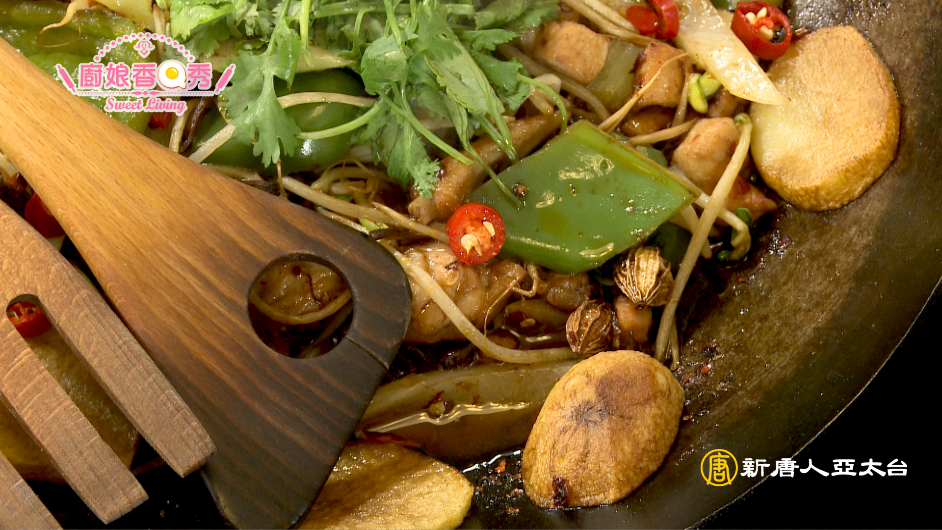 1. 加入當地的主食土豆、黃豆芽、青椒、芹菜、茶樹菇當乾鍋底。