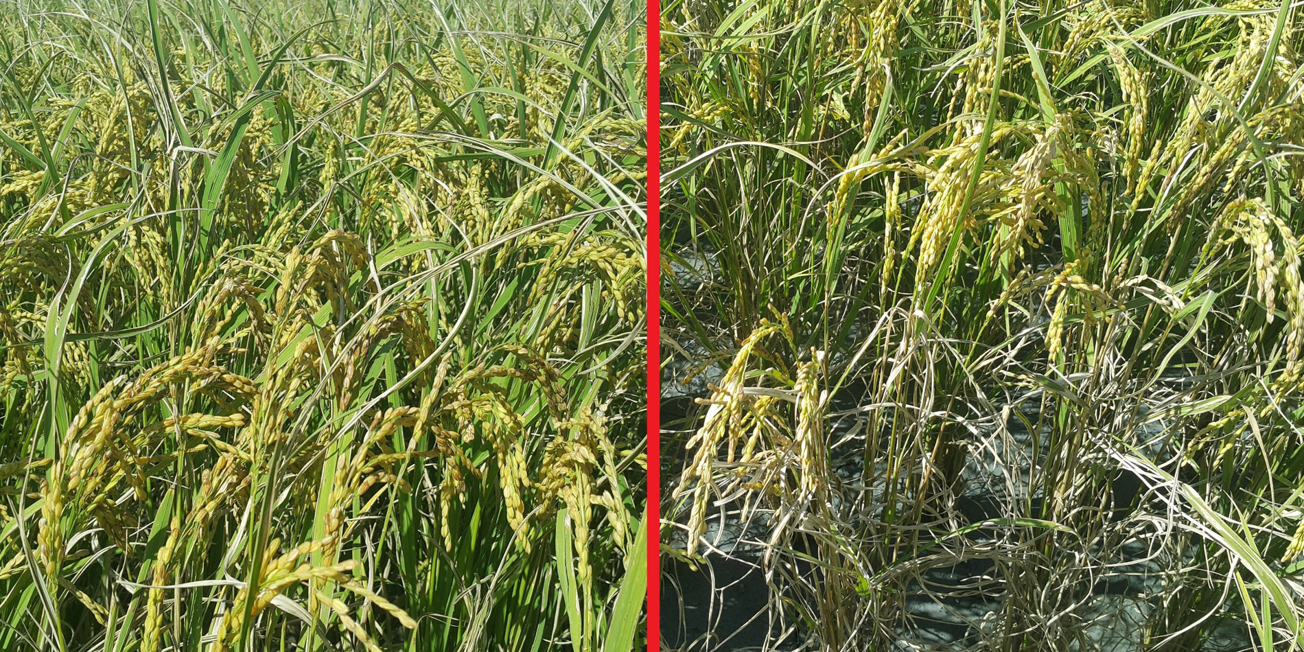 稻田應用生物炭可增加水稻抗病性及產量,圖左為應用生物炭,圖右為對照區不施用,水稻紋枯