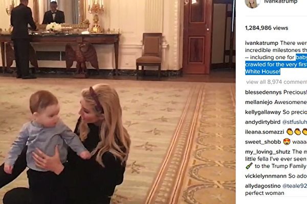 【新唐人亞太台 2017 年 01 月 29 日訊】美國總統川普自1月20日開始就職成為美國第45任總統,川普長女伊凡卡一家也隨著來到首都華盛頓。最近,伊凡卡在Instagram上發布了小兒子在白宮地毯上爬行的照片,十分可愛。