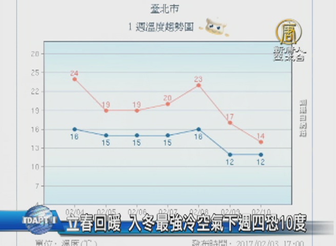 【新唐人亞太台 2017 年 02 月 03 日訊】今天是立春,24節氣中的第一個節氣,象徵春天的開始,隨著冷氣團減弱、全台氣溫回暖,頗有應景的感覺。不過,這樣的天氣只會維持2天,氣象達人彭啟明在臉書表示,周日,會有一波冷空氣南下,但溫度不會下降太多。真正要留意的是,下周四、五,會有一波號稱入冬以來最強的冷氣團,氣溫有可能會降到 10度以下,接近寒流等級。而且會影響 3到4天。不過專家也表示,目前的氣象預測,對超過 5天以上的預報,仍然有很大的變數,呼籲民眾留意氣象資訊的更新。