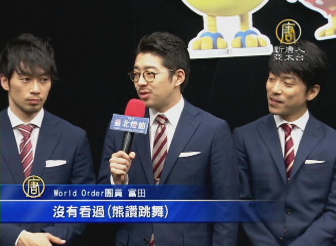【新唐人亞太台 2017 年 02 月 03 日訊】台北燈節也有特別來賓。因為去年(2016年)世大運宣傳影片,爆發抄襲疑慮,內容是熊讚跟西裝男 跳機械舞,被網友質疑是抄襲日本團體World Order,事後觀傳局將影片下架,為了破除抄襲謠言,觀傳局特地邀請World Order來台北燈節當嘉賓,熊讚還帶著台灣名產來探班。