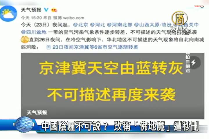 2017-01-24 10:04:24在中共通知各地暫停霾預警預報後,「霾」在中國的天氣預報中成為敏感詞,取而代之的是「空氣污染物」、「不可描述的天氣現象」。中國網民諷刺官方掩耳盜鈴、糊弄民眾;臺灣網友則諷刺「是在說佛地魔嗎?」