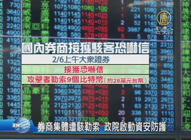【新唐人亞太台 2017 年 02 月 06 日訊】國內金融史上第一次,多家券商遭駭客勒索比特幣,揚言不付款就要發動攻擊,讓投資人無法在網頁下單,上周就有多家券商網頁被癱瘓,今天一早,又有券商公司遭到攻擊,行政院資安處表示必要時,將協調電信業者協助,也會啟動資安防護會議,升高防護層級。